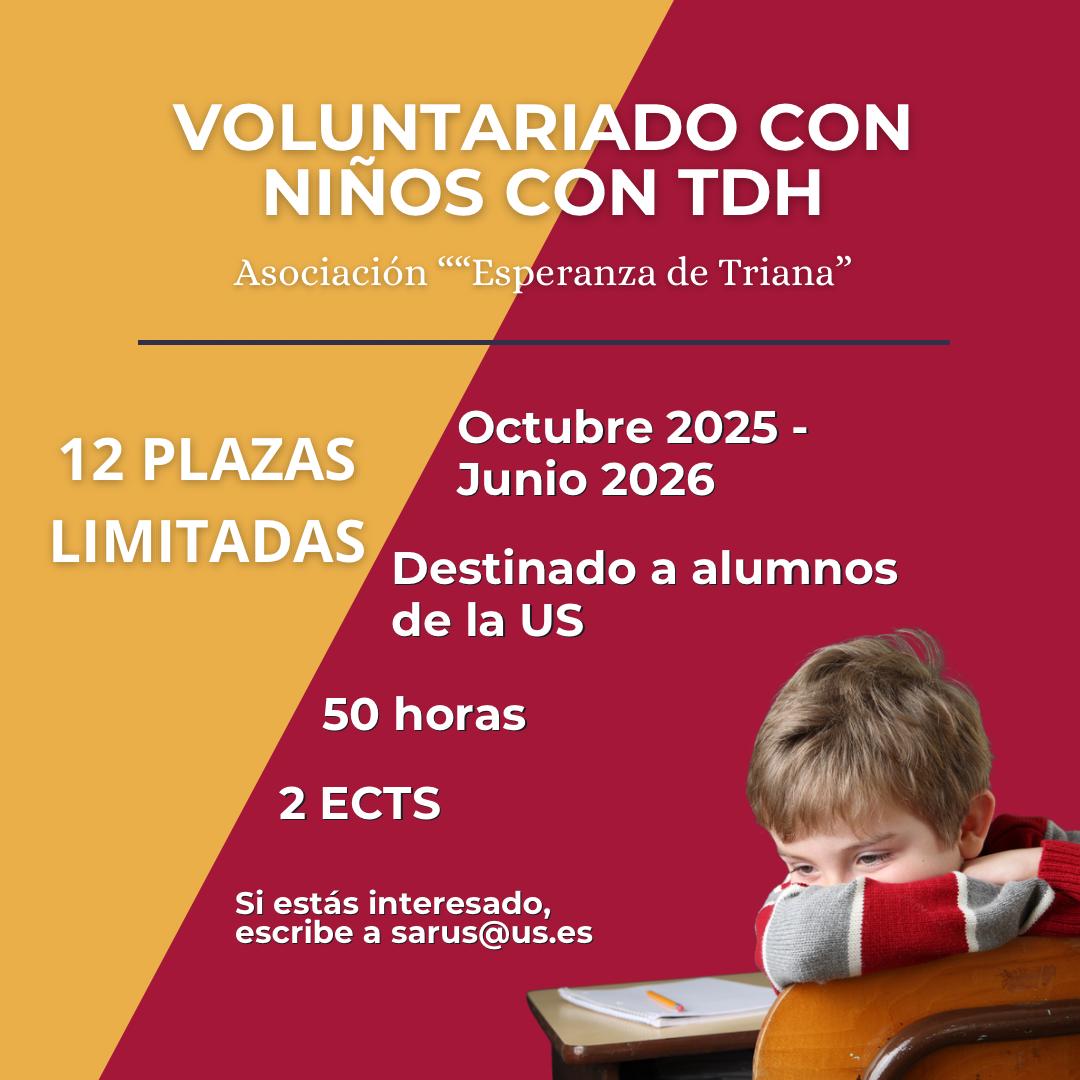 El Servicio de Asistencia Religiosa de la Universidad de Sevilla (SARUS) en colaboración con la Asociación Benéfico-Asistencial “Esperanza de Triana” propone la posibilidad de que estudiantes universitarios colaboren en el proyecto con niños con trastornos del déficit de atención con o sin hiperactividad que tan buenos resultados está alcanzando en los últimos años, tanto para los niños, como para las familias y los voluntarios. Se trata de apoyar una iniciativa ya asentada, dando la posibilidad a los estudiantes universitarios que realizan este voluntario de que se les reconozca las horas de servicio a la sociedad.